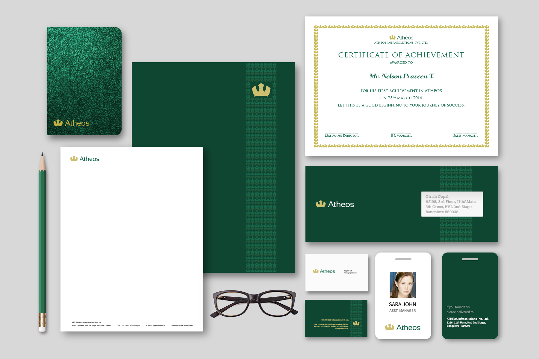 Atheos Infra solutions is a ten year old established company which has a bunch of prestigious hotels and companies as their clients. When the Managing Director narrated to me about his company and what it represents, he paid emphasis to the royal service they provide to their clients. While working on redesigning their brand, I was very keen on representing their royal heritage not only in the logo but in their brand identity as well. This project gave me not only a loyal and long lasting client, but a good mentor as well.